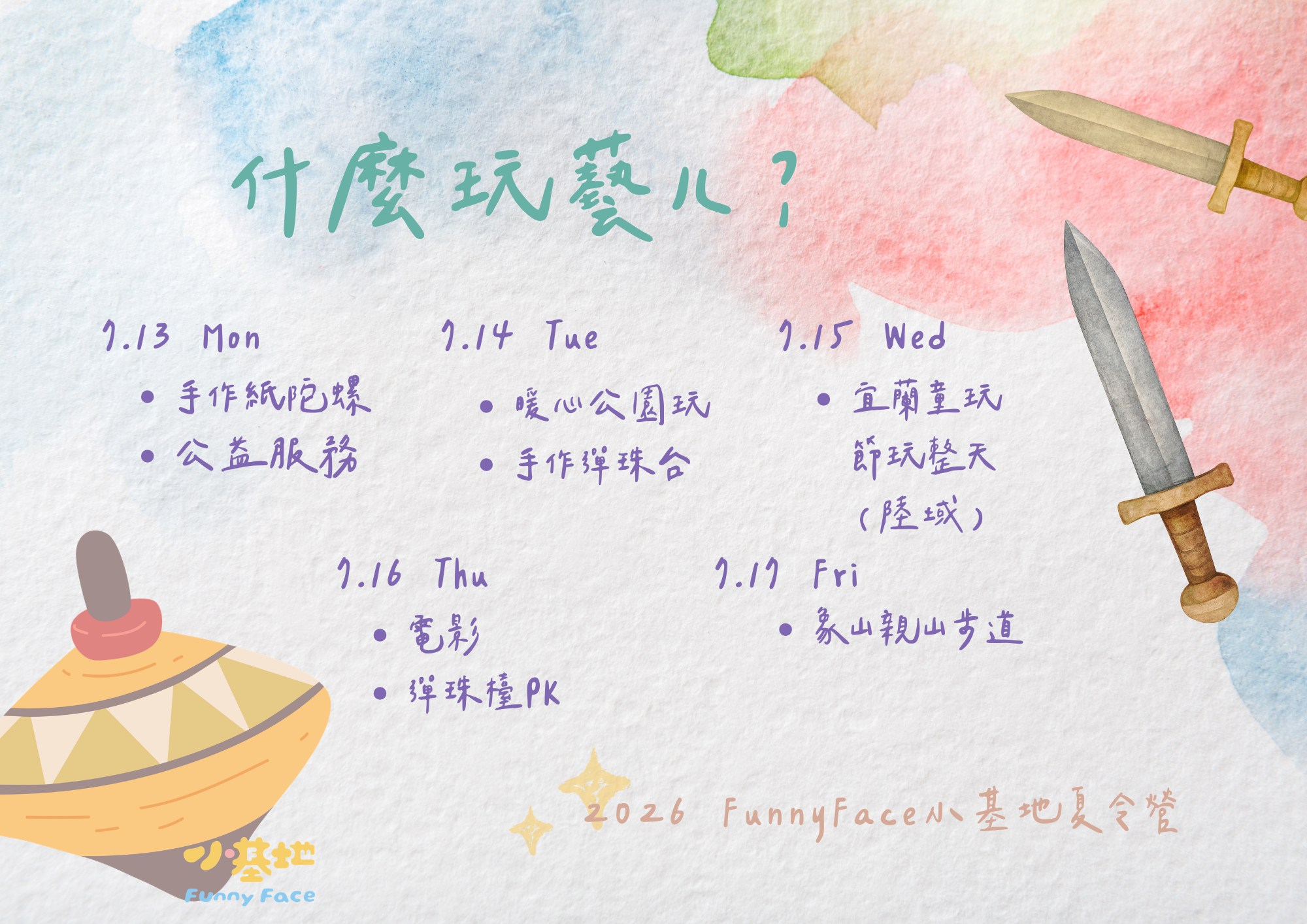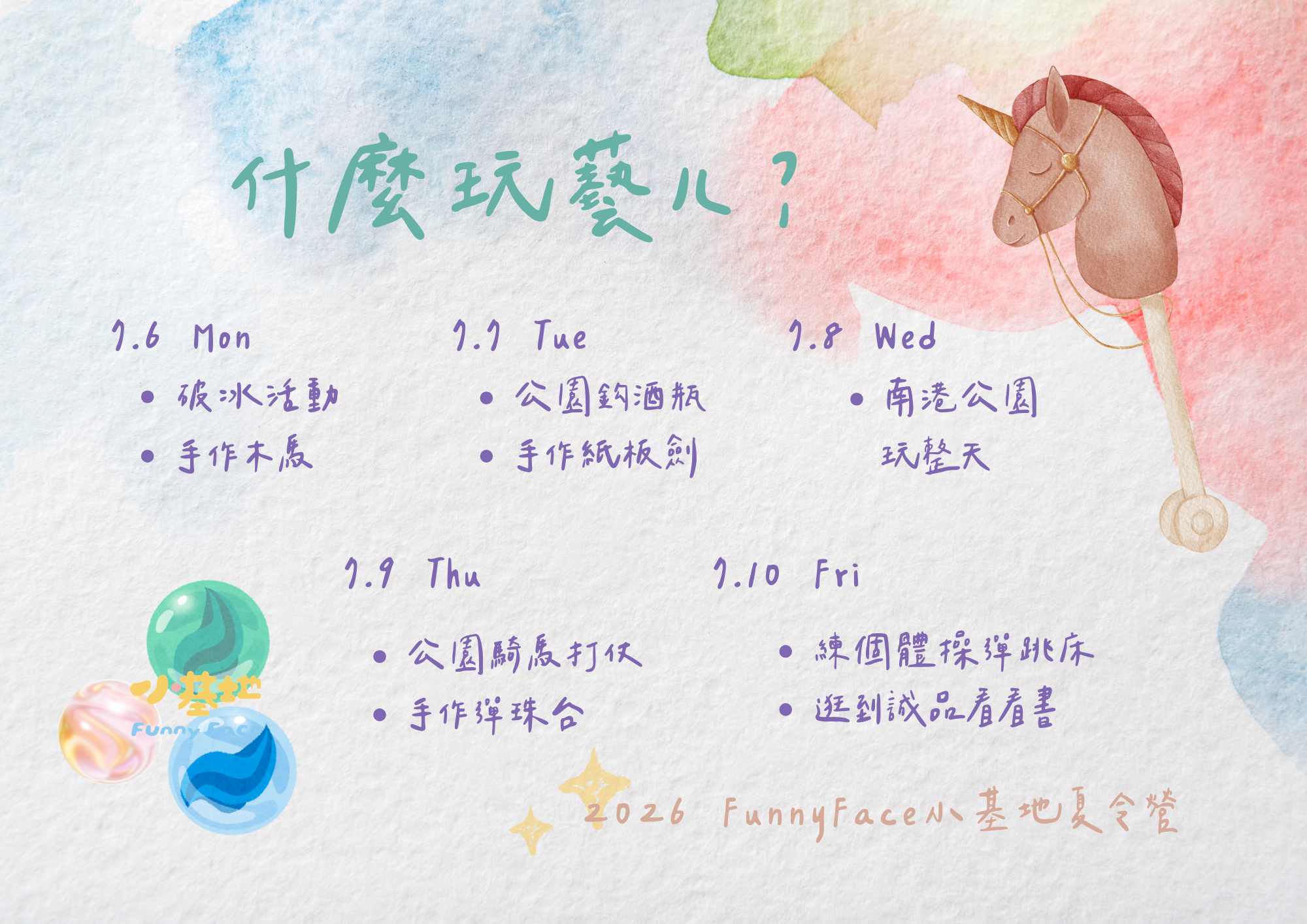 🔸 活動期間以表定行程為主,但會依天氣與孩子狀況彈性調整。FunnyFace 小基地保有最終行程調整與變更之權利。