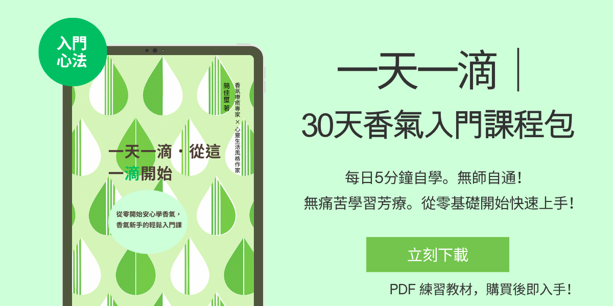「一天一滴,從這一滴開始」是一份 PDF 格式的 30 天香氣入門練習包。每天提供入門芳香指導、實用練習與回顧頁,不需死背化學式,也不擔心專有名詞,每天一堂課,輕鬆無負擔。