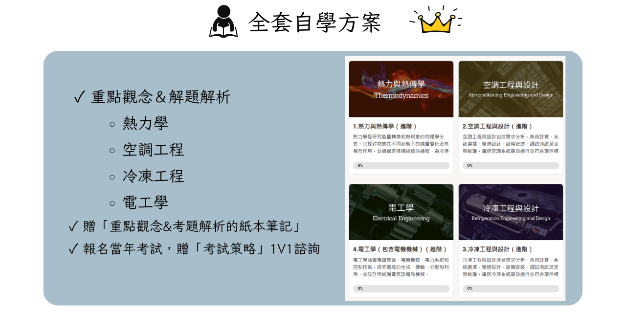 【全套自學方案】— 冷凍空調高效考取計畫 + VIP社群(含熱力學、空調工程、冷凍工程、電工學)
