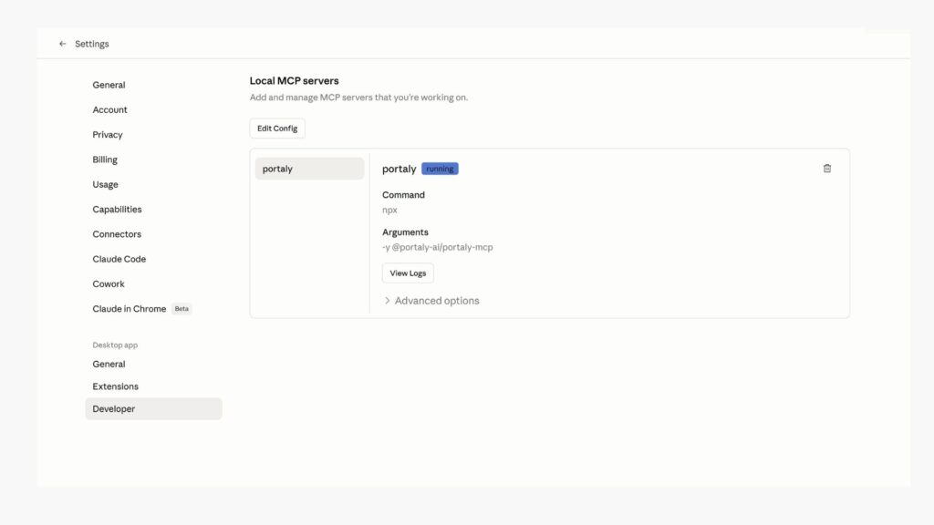 “PORTALY_API_TOKEN”: “mcp_ptly_xxx”