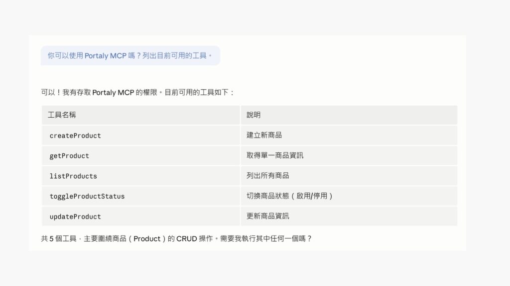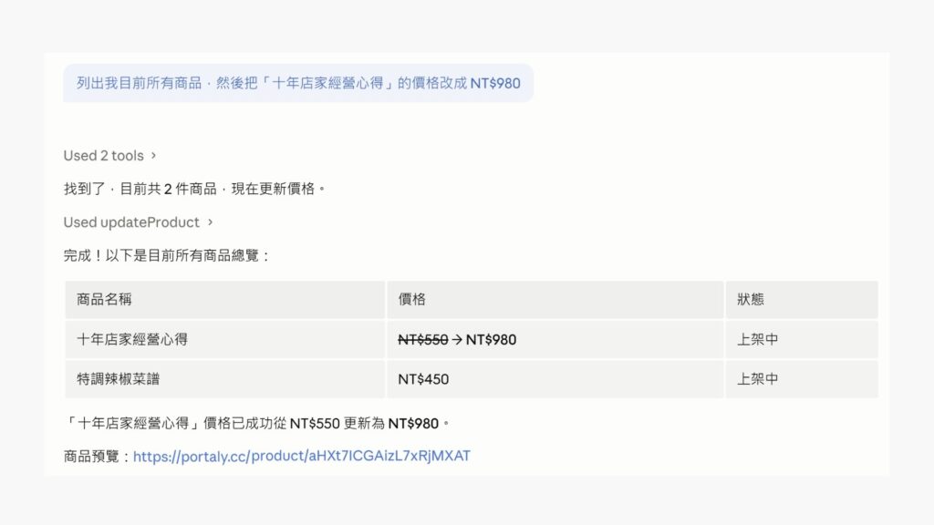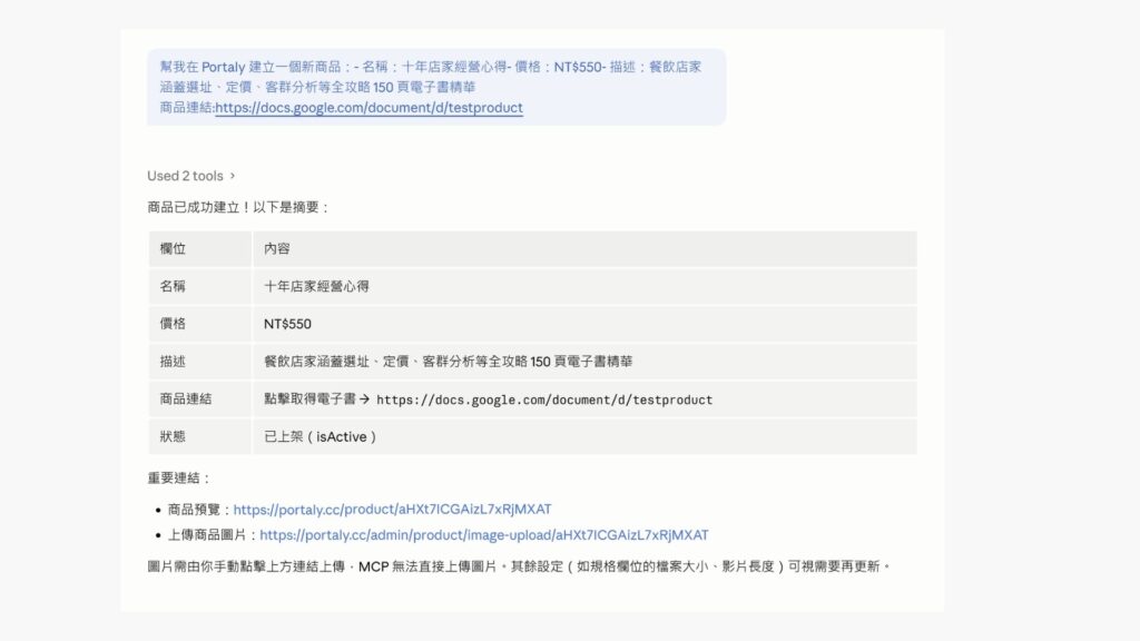 AI 就會直接呼叫 Portaly API,在你的後台建立商品,你甚至不需要打開 Portaly 管理介面。