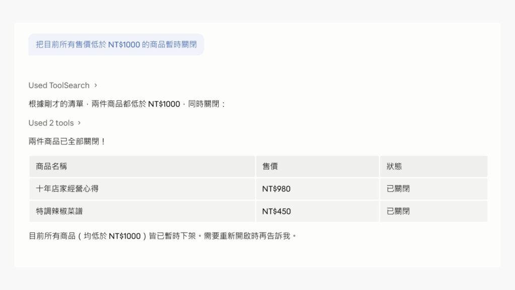 AI 會取得商品列表,找到目標商品 ID,再完成更新——全程你只需要說一句話。