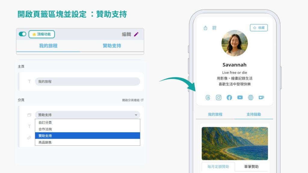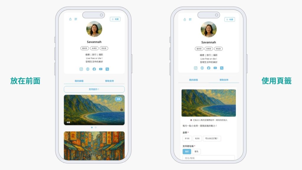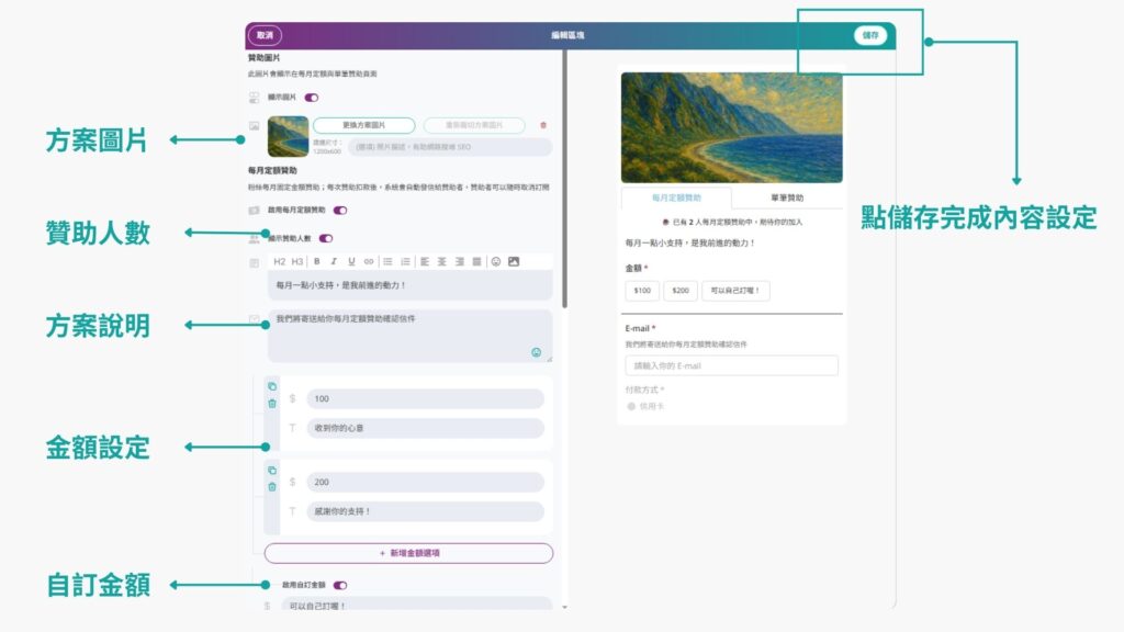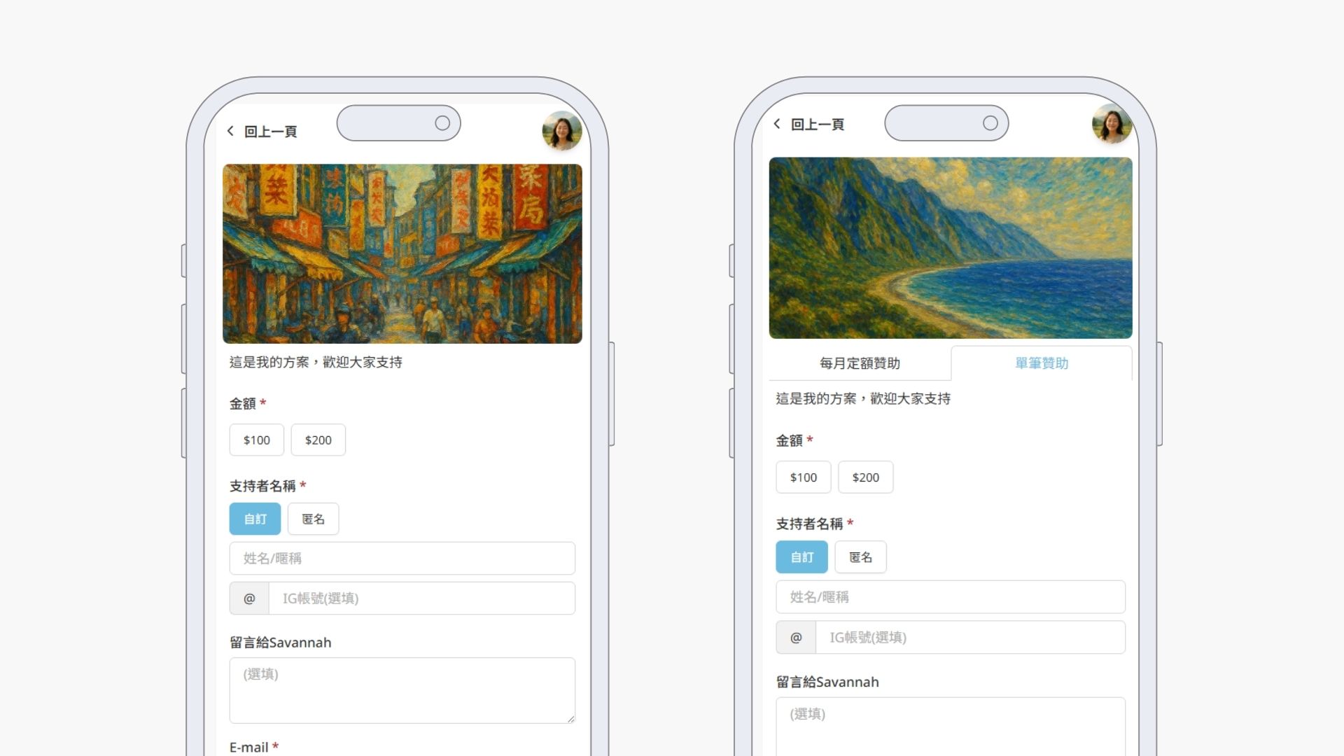 你可以透過自定圖片、文字、回饋內容,設計出精美的贊助頁面。此外贊助者也能填寫自己的名稱與回饋,讓贊助不只是單純的捐贈,而是雙向的粉絲互動。