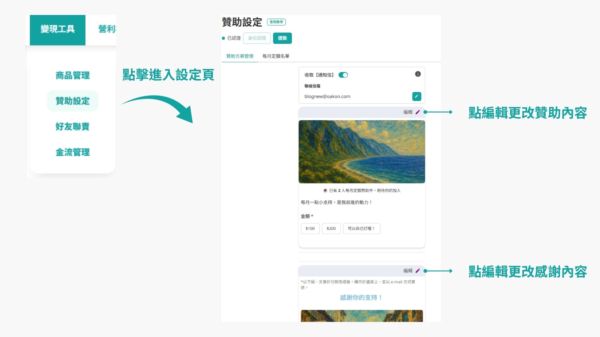 前後個人後台,選擇「經營工具」>「贊助管理」即可開始編輯自己的贊助計畫。首次開啟時會出現視窗詢問是否設定收款資料,你可以選擇先填寫,或是等未來要提領款項時再度填寫申請即可。