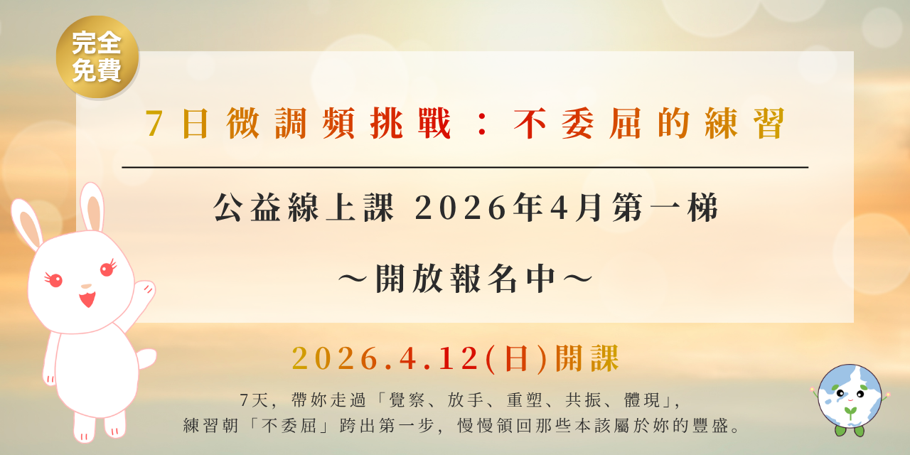 本活動(《公益線上課》7 日微調頻挑戰:不委屈的練習、以下簡稱「本活動」。)屬資訊分享性質,內容可涉及個人成長經驗、冥想引導與自我觀察練習。主辦方不保證任何特定之身心成效。