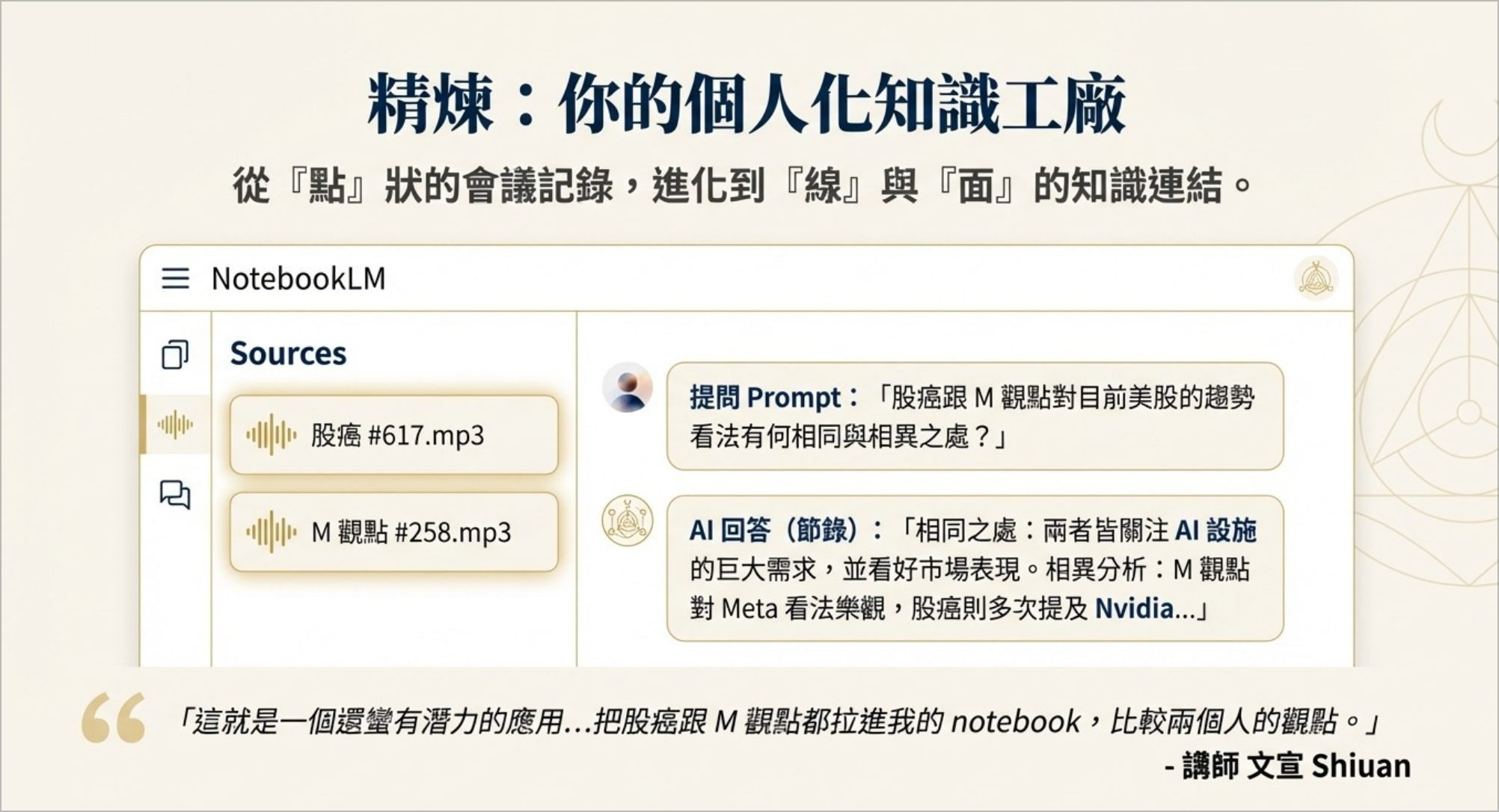 我的核心強項(也是這堂課的價值),就是把複雜的工具(NotebookLM, AI Studio)包裝成「可複製的 SOP」。