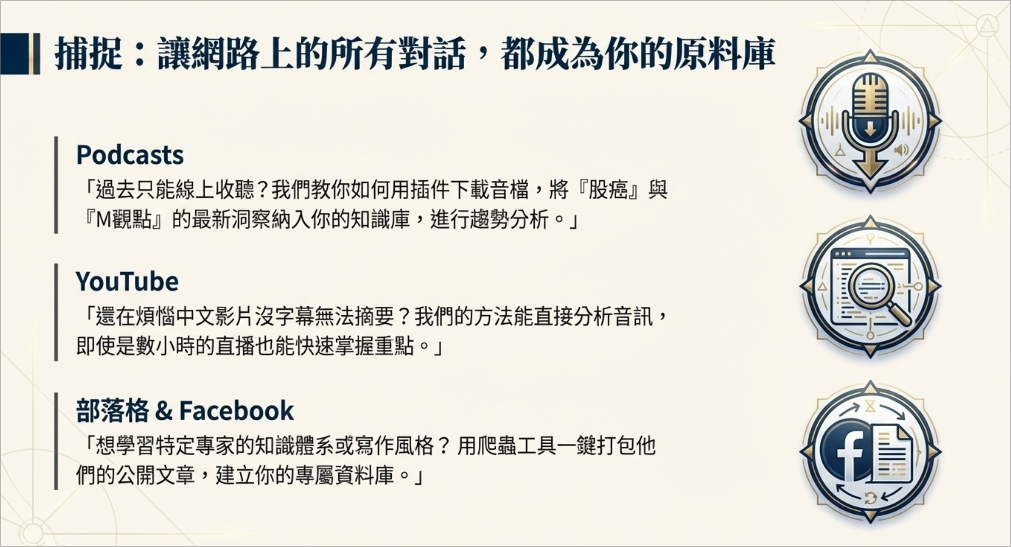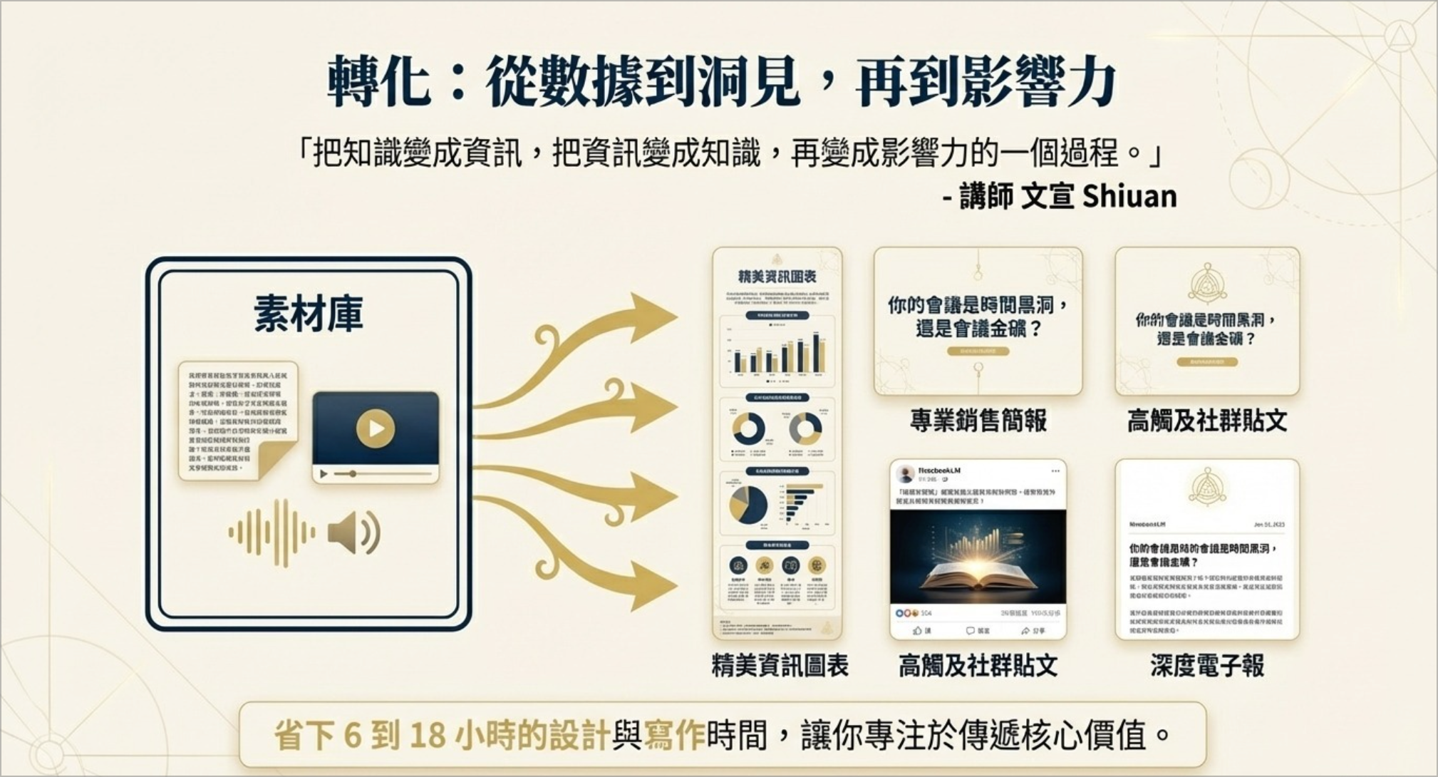 - 社群內容煉金術:1 小時節目 → 可引用金句卡+貼文骨架