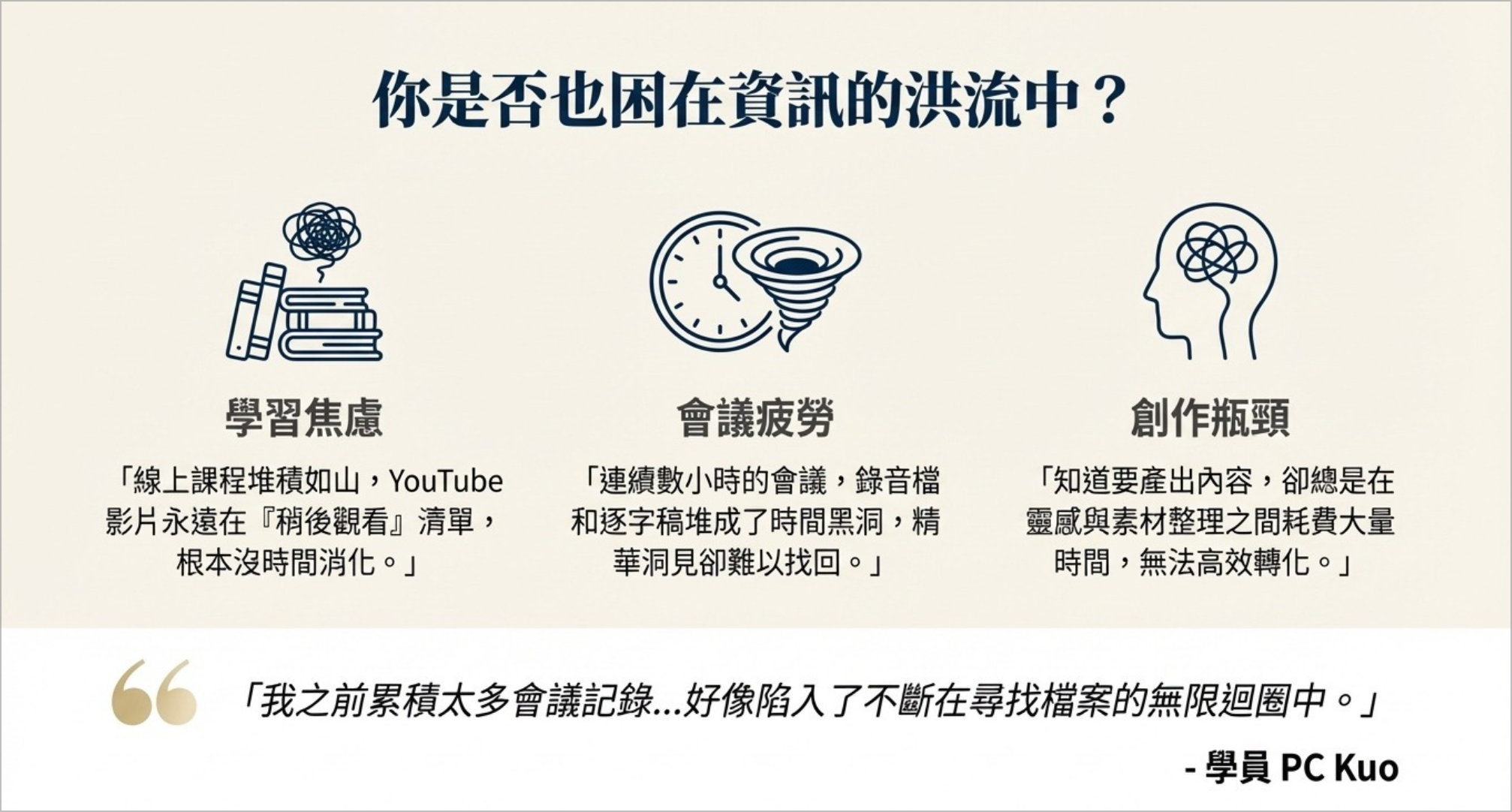 - 來源更廣: 不只會議,還包括 Line 對話、Podcast、線上課程 (你看不完的課)。