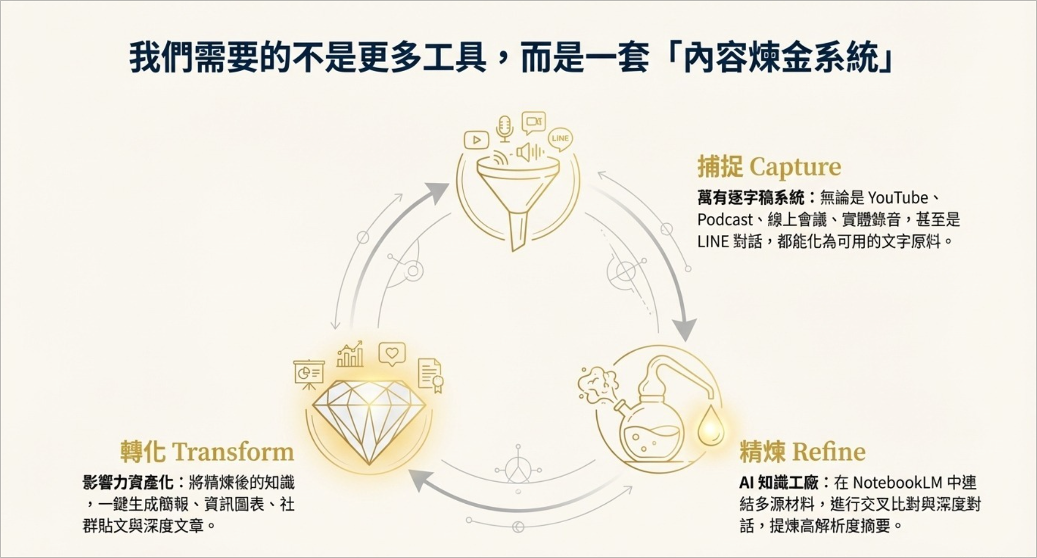 - 資產庫(Transform):NotebookLM/Heptabase 的結構化沉澱