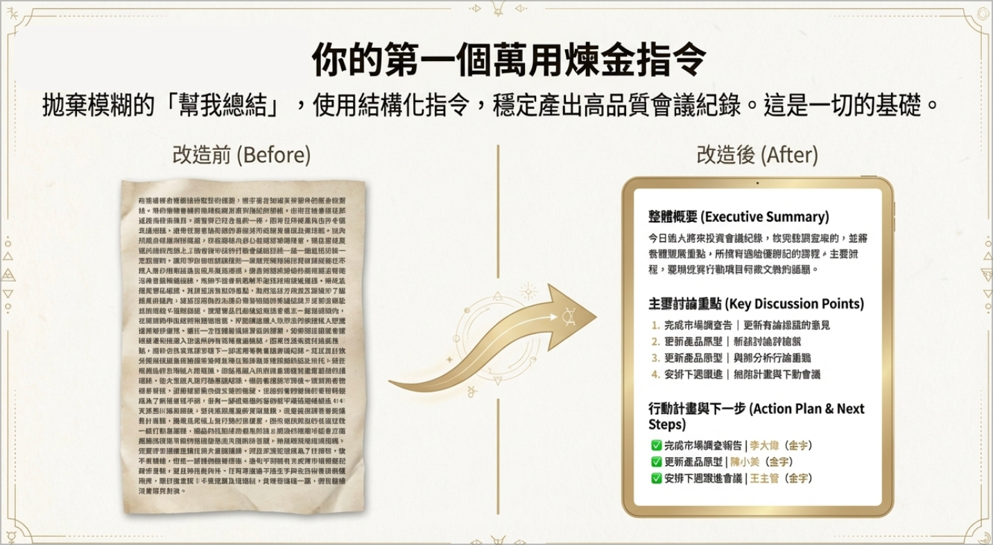 會議結束不只是存檔,而是「影響力」的開始。 這組指令能將生硬的會議紀錄,一鍵轉化為: