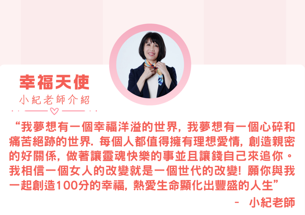 一百分幸福女人學創辦人。 運用潛意識調整協助上百位女性找到理想伴侶、修復破裂關係、找到天賦做熱愛的事,活出幸福關係與豐盛人生。