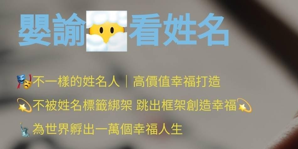 Hi!我是嬰諭,在這誠摯地邀請您贊助「嬰諭看姓名」活動,這是一個專注於姓名解析的特別項目。我相信,每個名字都蘊含著深遠的意義和祝福,透過姓名學的智慧,我希望為每一位帶來最美好的祝願。