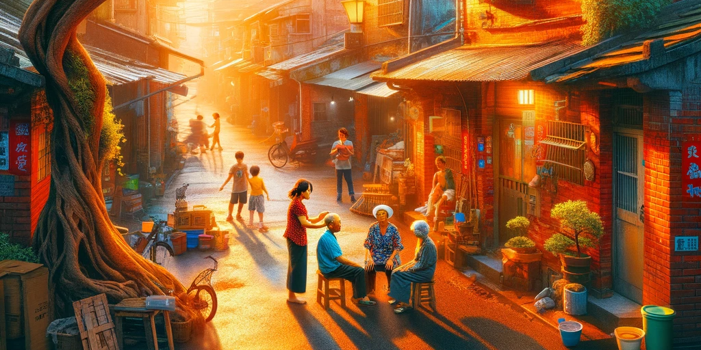 這幅畫描繪了台北市一個傳統軍眷村在傍晚時分的溫馨景象。畫中的紅磚房屋、狹窄的巷弄,以及社區中的居民和遊玩的孩子,共同營造出一個充滿活力的社區氛圍。一棵古老的樹木在此情此景中顯得格外突出,而夕陽的溫暖光芒透過樹葉投射下來,為本村增添了一份既生動又令人心情愉悅的色彩。