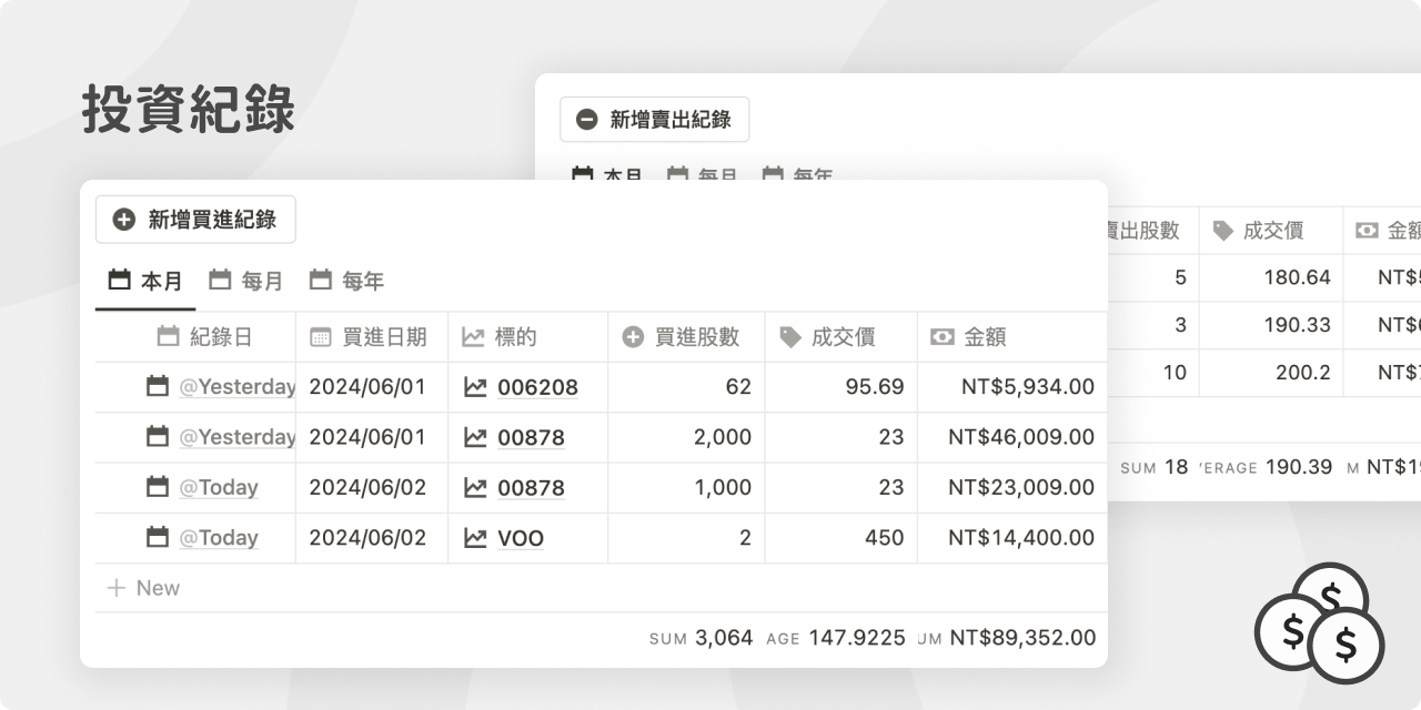 - 追蹤買賣紀錄:每次買進或賣出時,將資料填入來紀錄