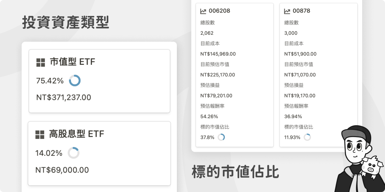 - 追蹤投資資產類型佔比,如市值型 ETF、高股息型 ETF 與個股間的配置比例,也能了解所有標的之間的佔比