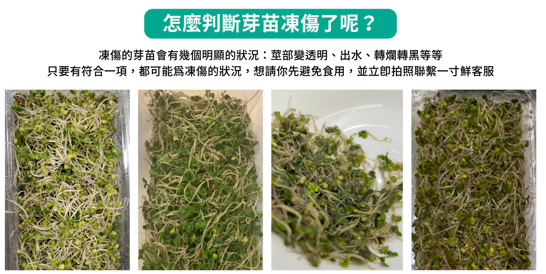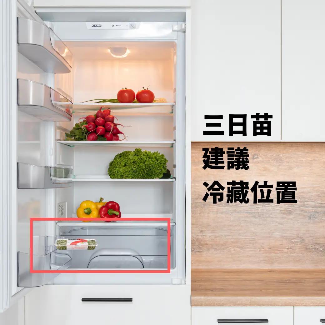請置於蔬菜冷藏區或下層空間,上層容易讓芽苗凍傷。建議包裝日期後(示意圖) 7-10 天內食用完,真的吃不完要冷凍,請直接加入綠拿鐵一起打、不要解凍。解凍過程會減弱酵素活性而影響蘿蔔硫素吸收。