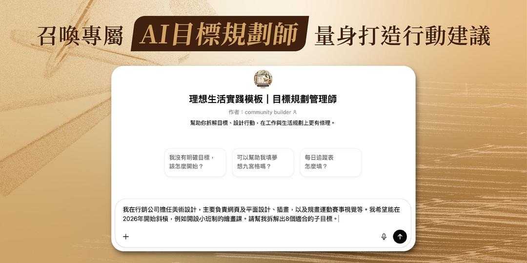如果仍覺得迷茫,「AI 目標規劃師」會像溫柔的夥伴,幫你把模糊的願望拆解成 8 個可行步驟,讓起點不再遙遠。