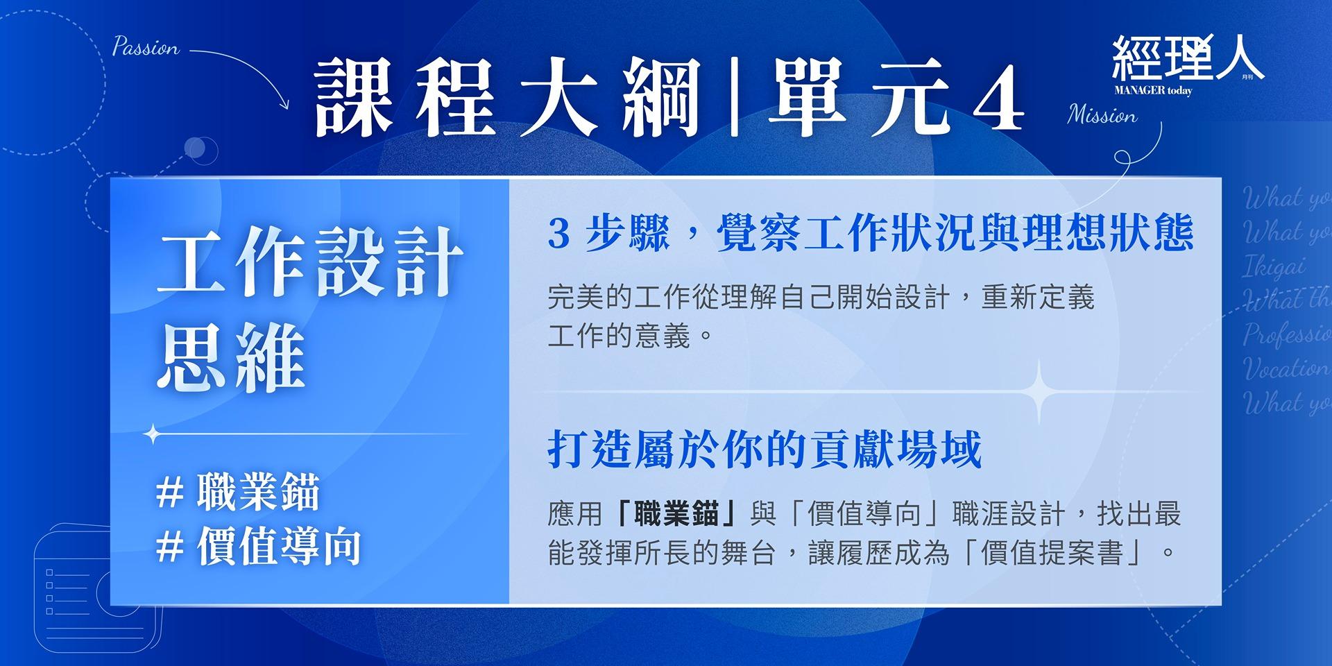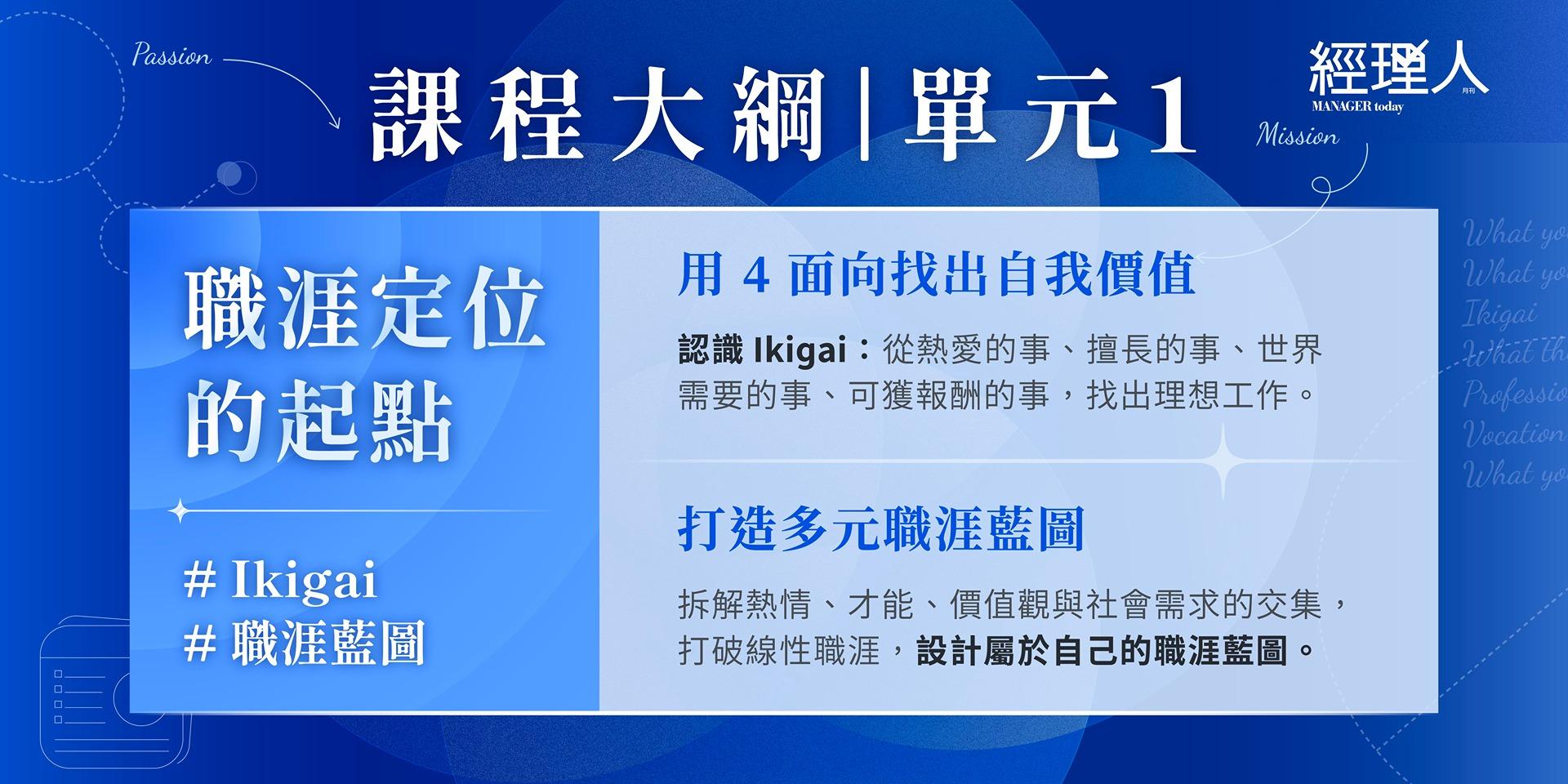 「熱愛的,不一定能賺錢;擅長的,不一定喜歡;能賺錢的,不一定適合你。」這門課透過系統性探索,幫你找到真正的交集點,打造出一條屬於你的理想職涯藍圖。