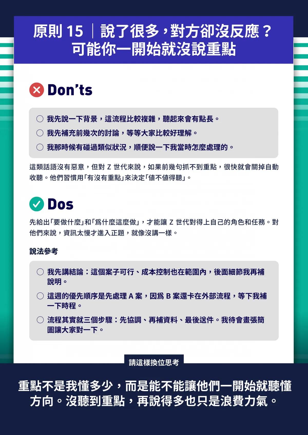 - Z 世代溝通習慣對照表:你的用語、頻率與溝通方式踩雷了嗎?快速檢視你是否正在用 Z 世代聽不進去的語言交辦事情,幫你調整回饋節奏、表達方式、語氣與介入時機。