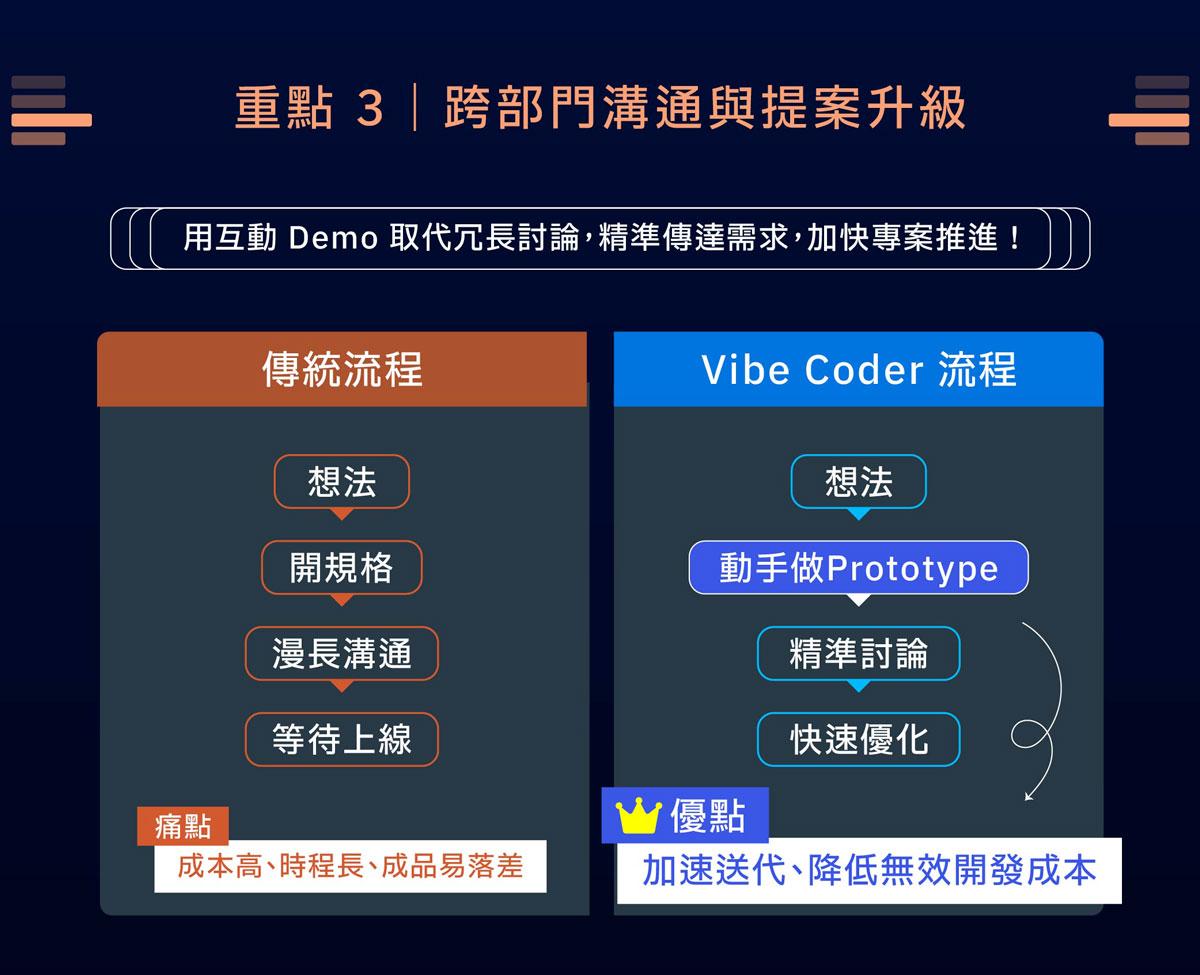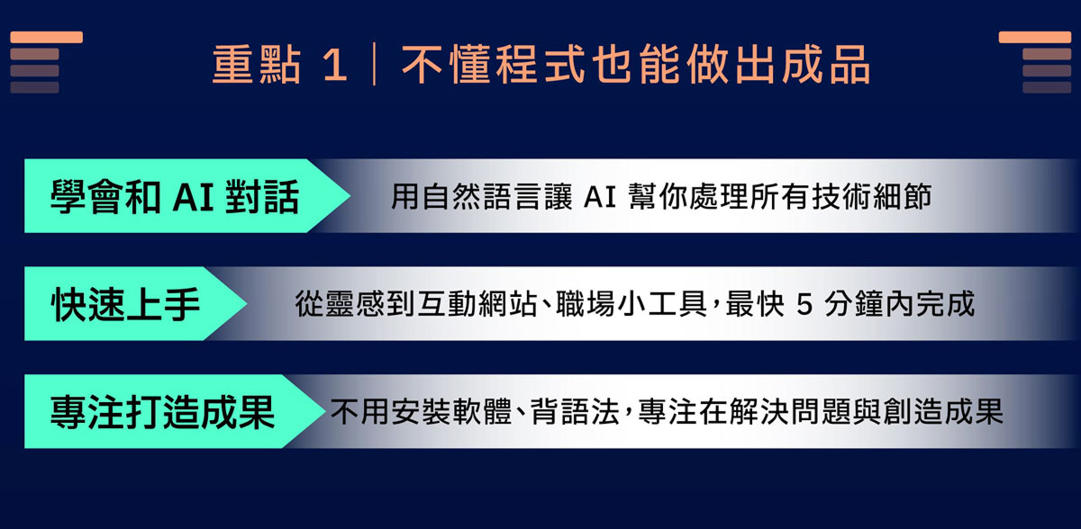 - Vibe 心法:學會描述需求與功能,讓 AI 負責技術細節。