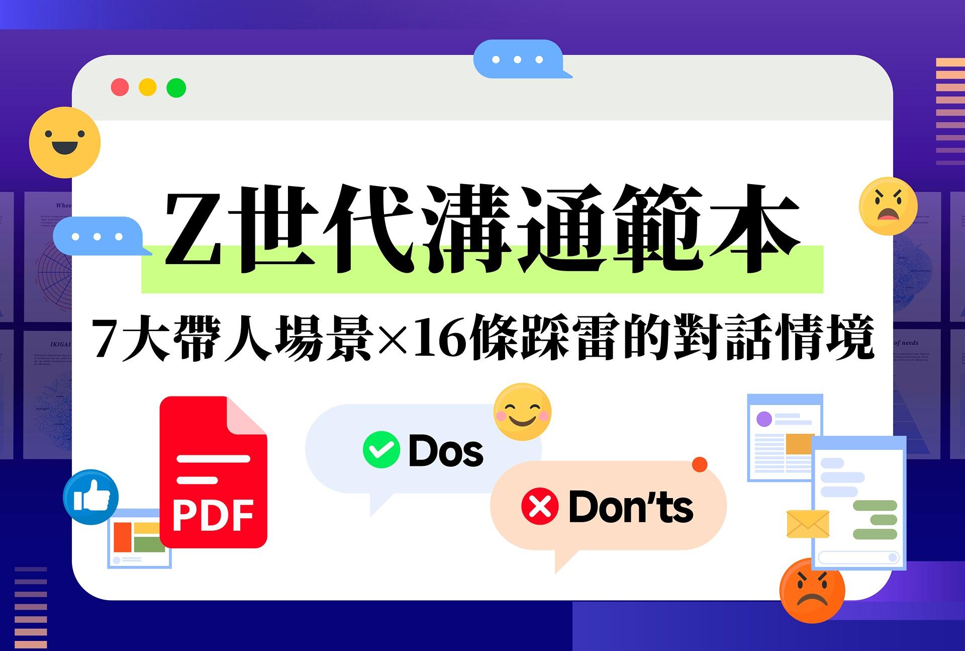 - Z 世代溝通習慣對照表:你的用語、頻率與溝通方式踩雷了嗎?快速檢視你是否正在用 Z 世代聽不進去的語言交辦事情,幫你調整回饋節奏、表達方式、語氣與介入時機。