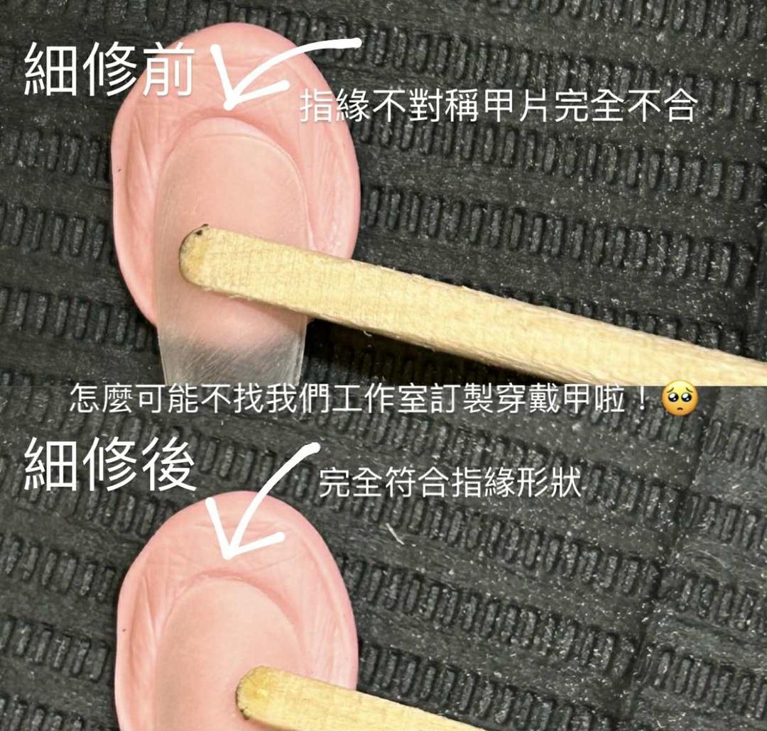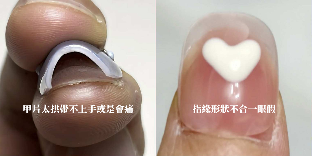 市售成品無法對照每個人指甲弧度長度尺寸訂製,無法完全貼合,常出現不舒適、易掉落的問題。