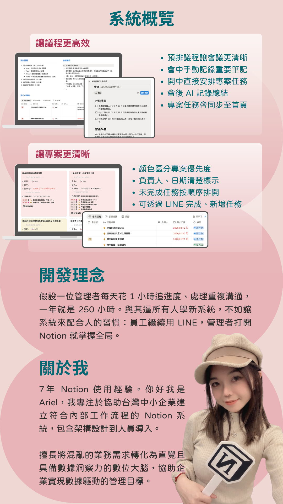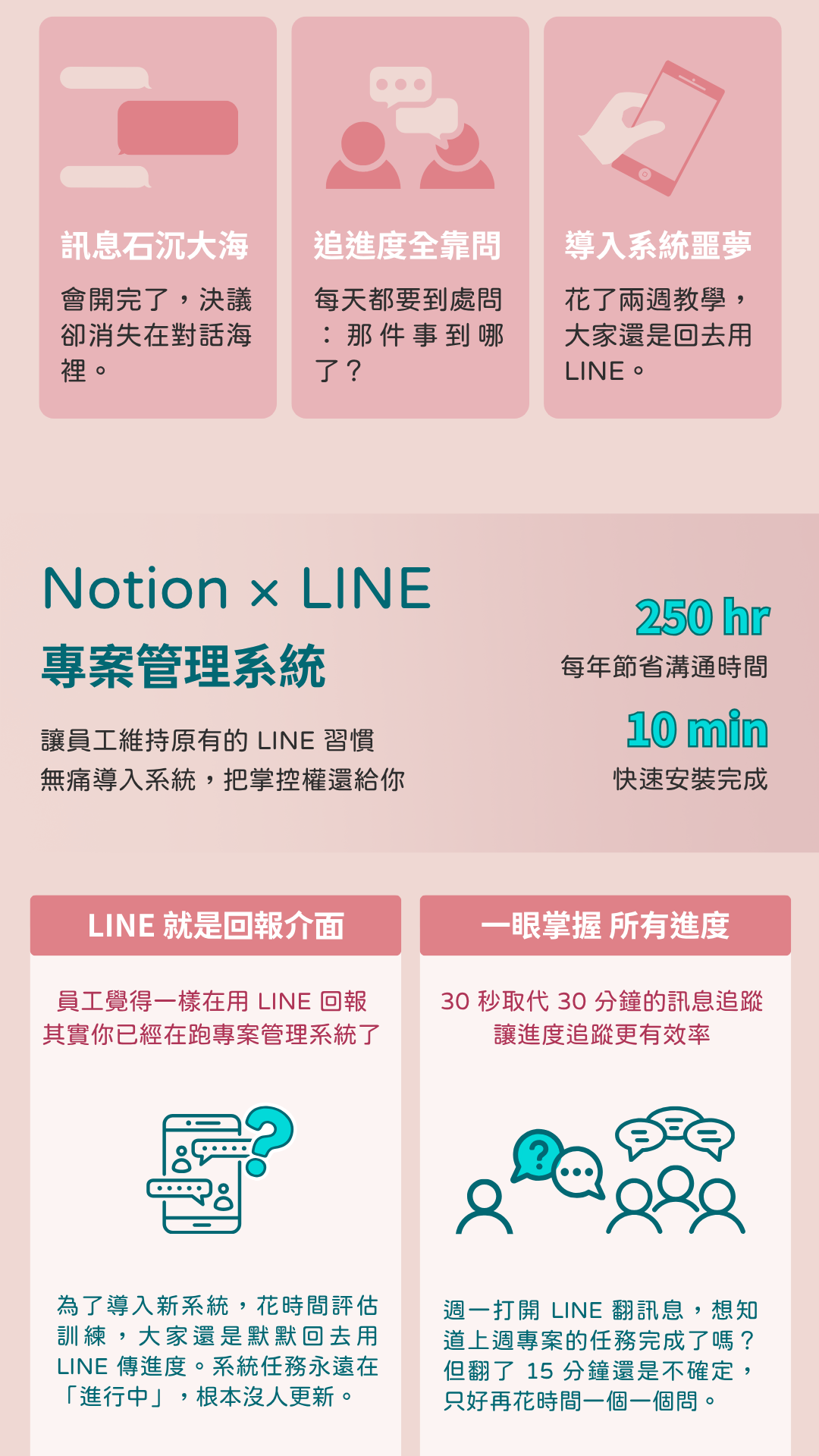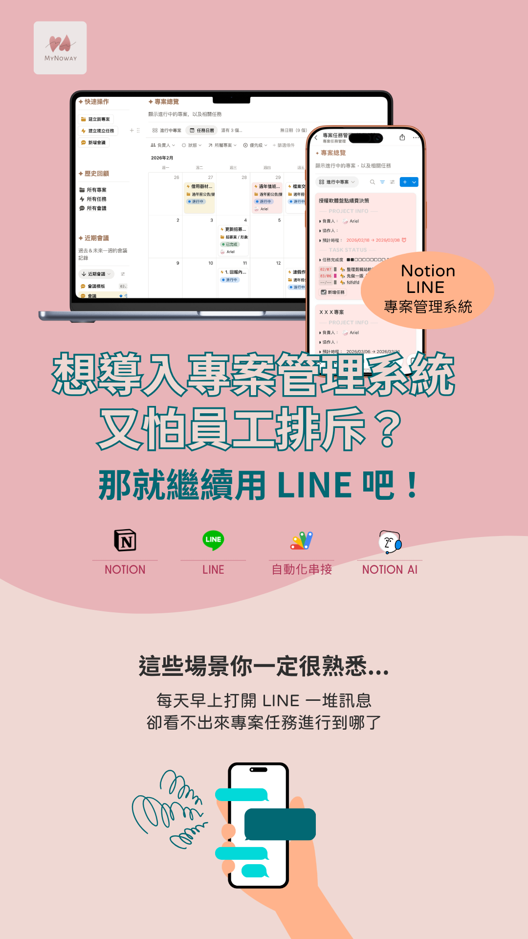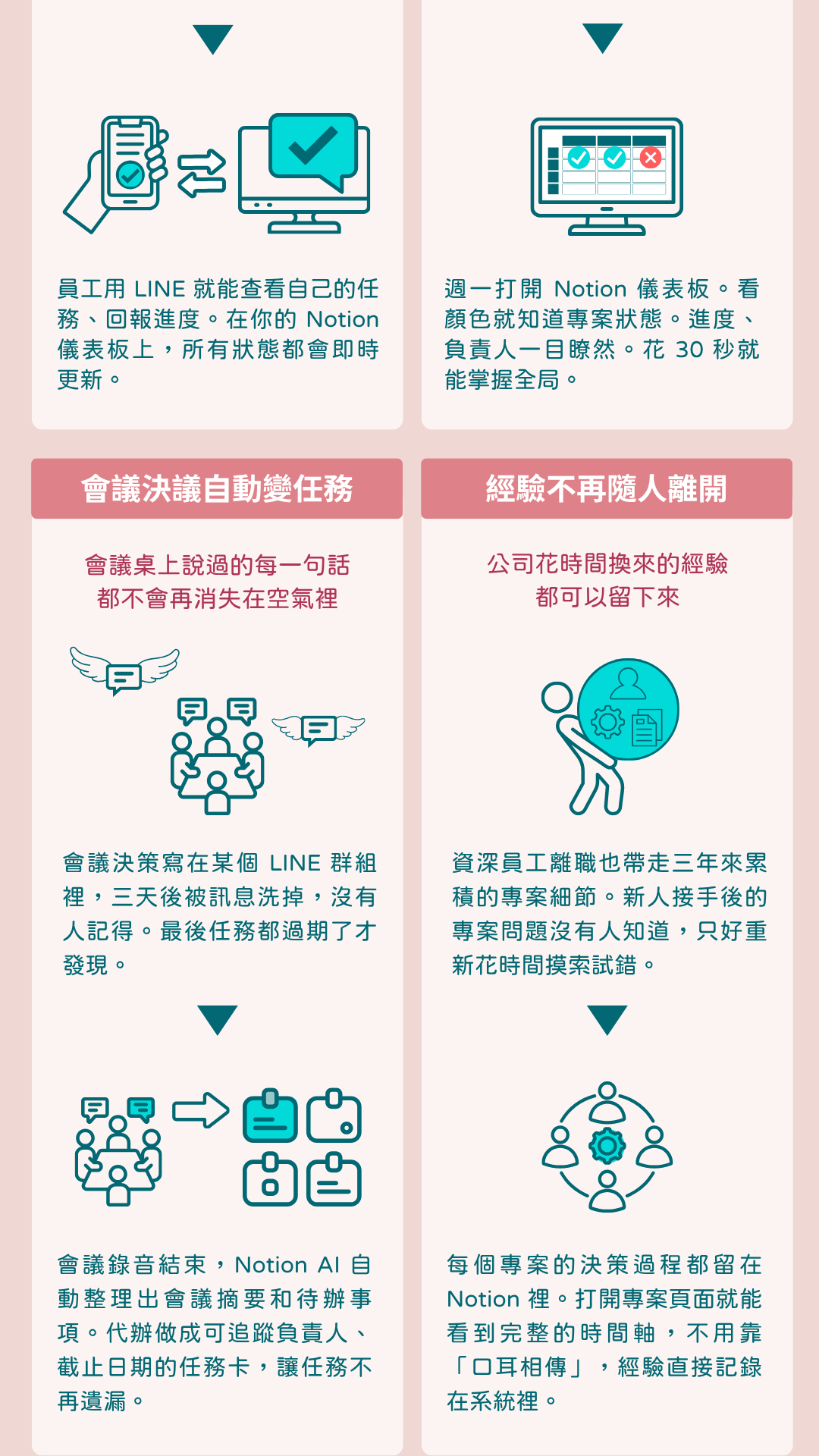 只有核心管理者、會議記錄者需要操作 Notion 介面。其餘員工只需要在 LINE 上點擊按鈕即可查詢專案任務、更新任務狀態,系統會自動同步到 Notion。執行者無感轉換,管理層效率翻倍。