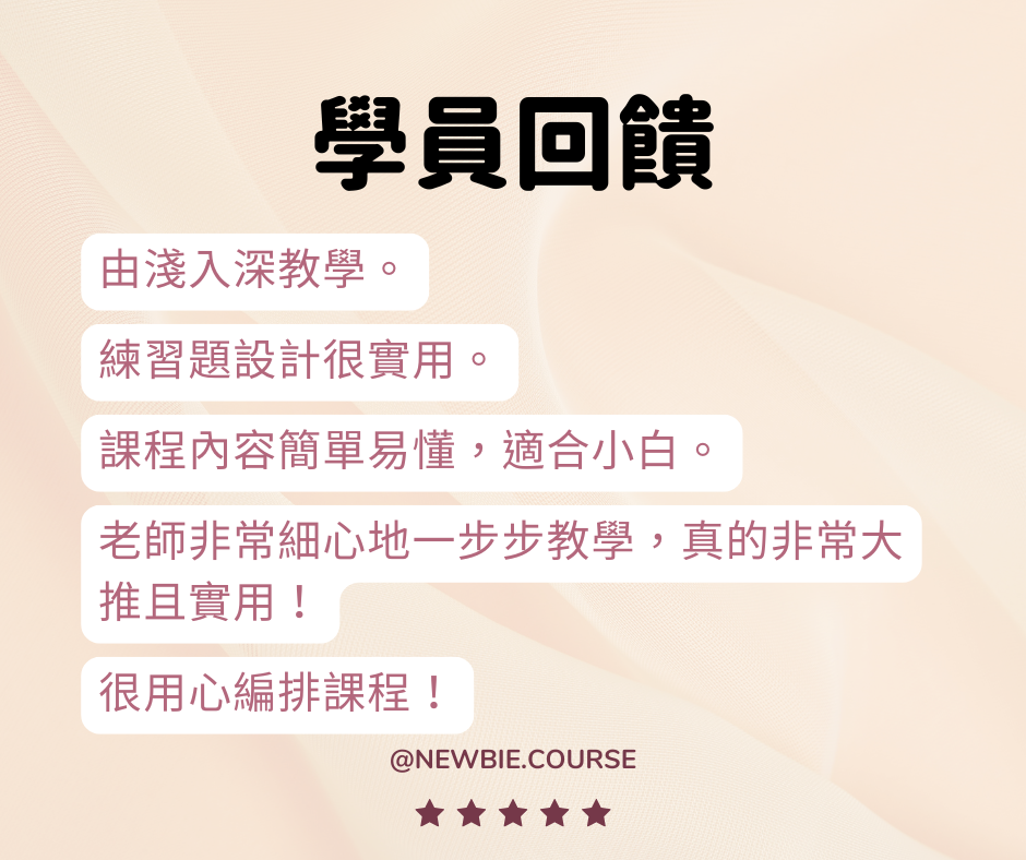 - 課堂上會透過 12 種小練習、 4 個實作案例以及 3 個範例多次演練,讓你不單單只是學過,而是真正學會!
