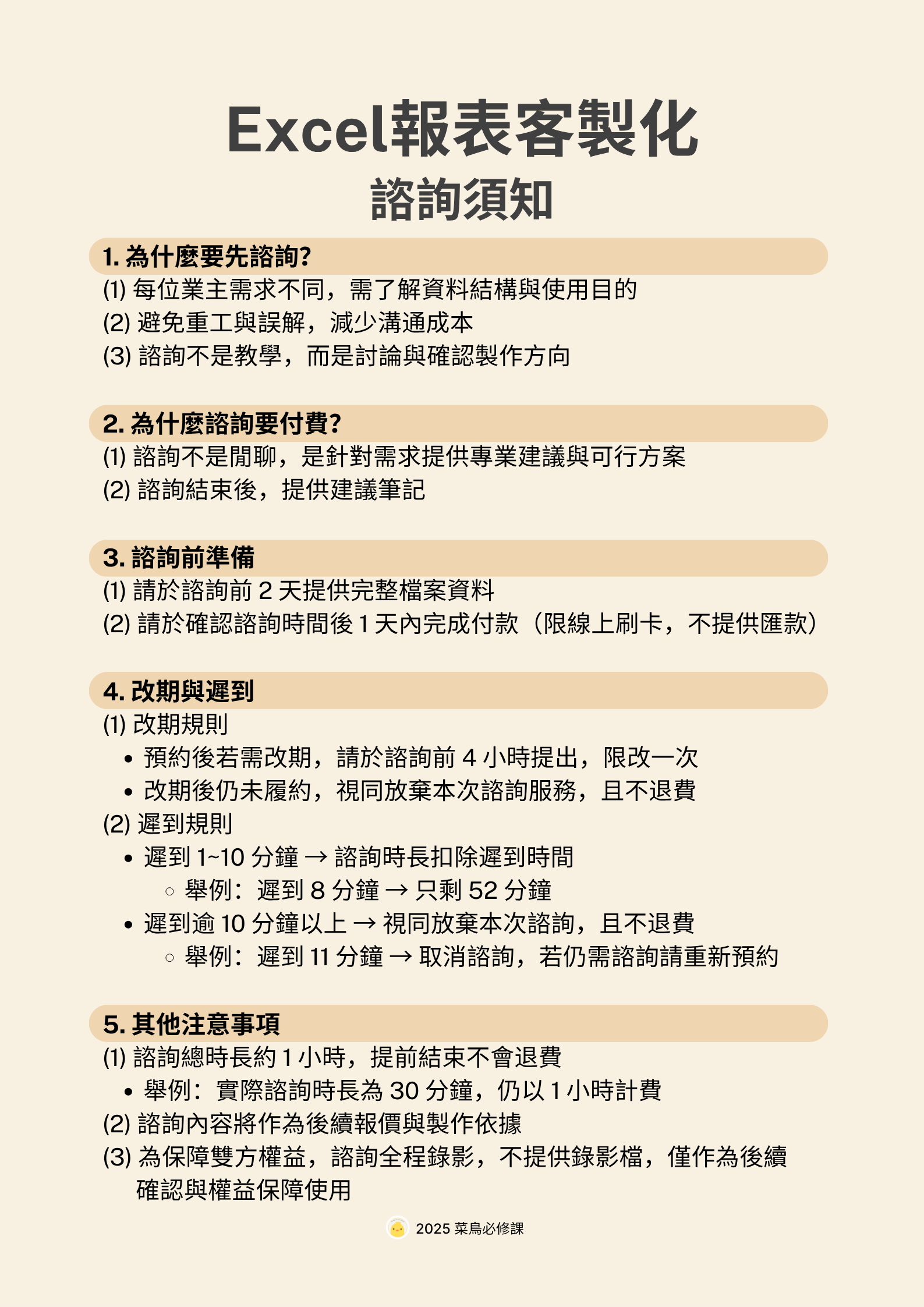 A3:結案後 1 個月內(30 天),若有表格使用問題,我都會協助解決,包含疑難排解、表格使用指導,但不含修改公式與大範圍調整。如需再次調整,費用另計。