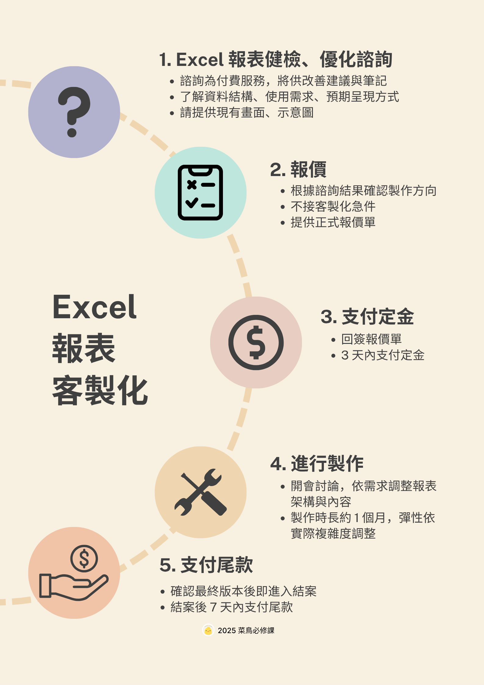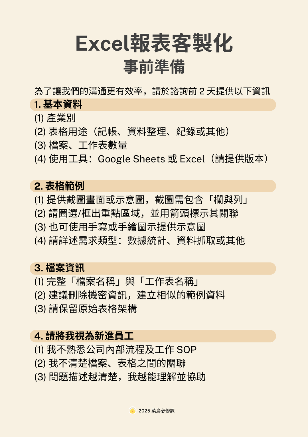 A1:完全沒問題!你只需要提供現有的表格並說明需求,我會協助你設計成好操作、好維護的報表,就算不懂公式也能照樣使用。