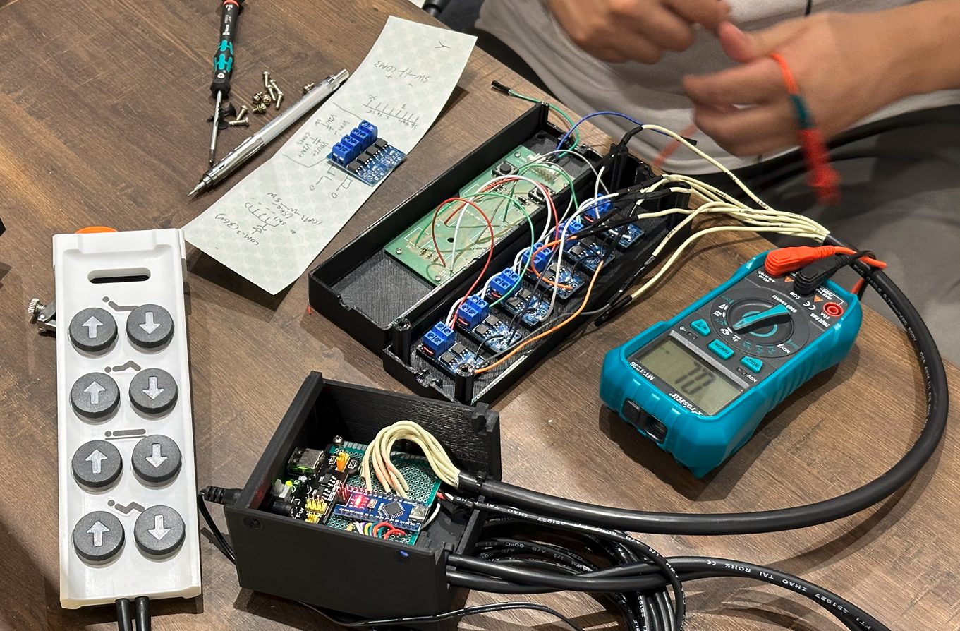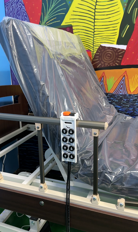 設計上為符合醫材相關法規、避免對醫療電動床進行破壞或侵入式改造,幾番思考後選擇了外掛式的硬體系統,僅替換電動床原廠的有線遙控器,不對電動床的原廠主機(馬達控制系統)做任何更動。