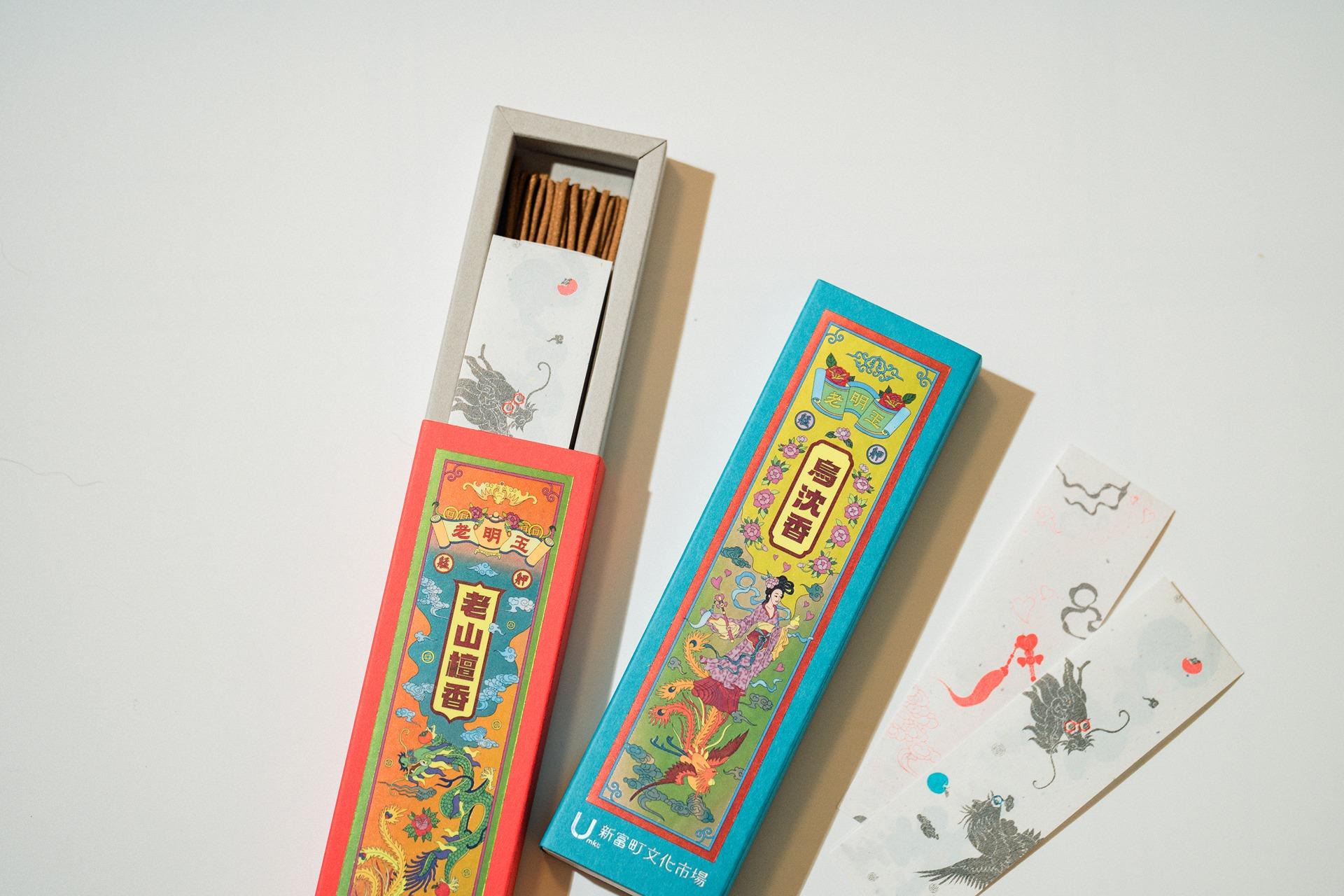 新富町文化市場攜手萬華在地百年香舖老明玉,推出「新富選香」,精選兩款經典香氣,邀請插畫家 Yuning 將傳統視覺注入當代藝術元素,商品包裝則由萬華創作者暇瑕寫字工作室設計製作,將艋舺手製臥香的輕巧轉譯。