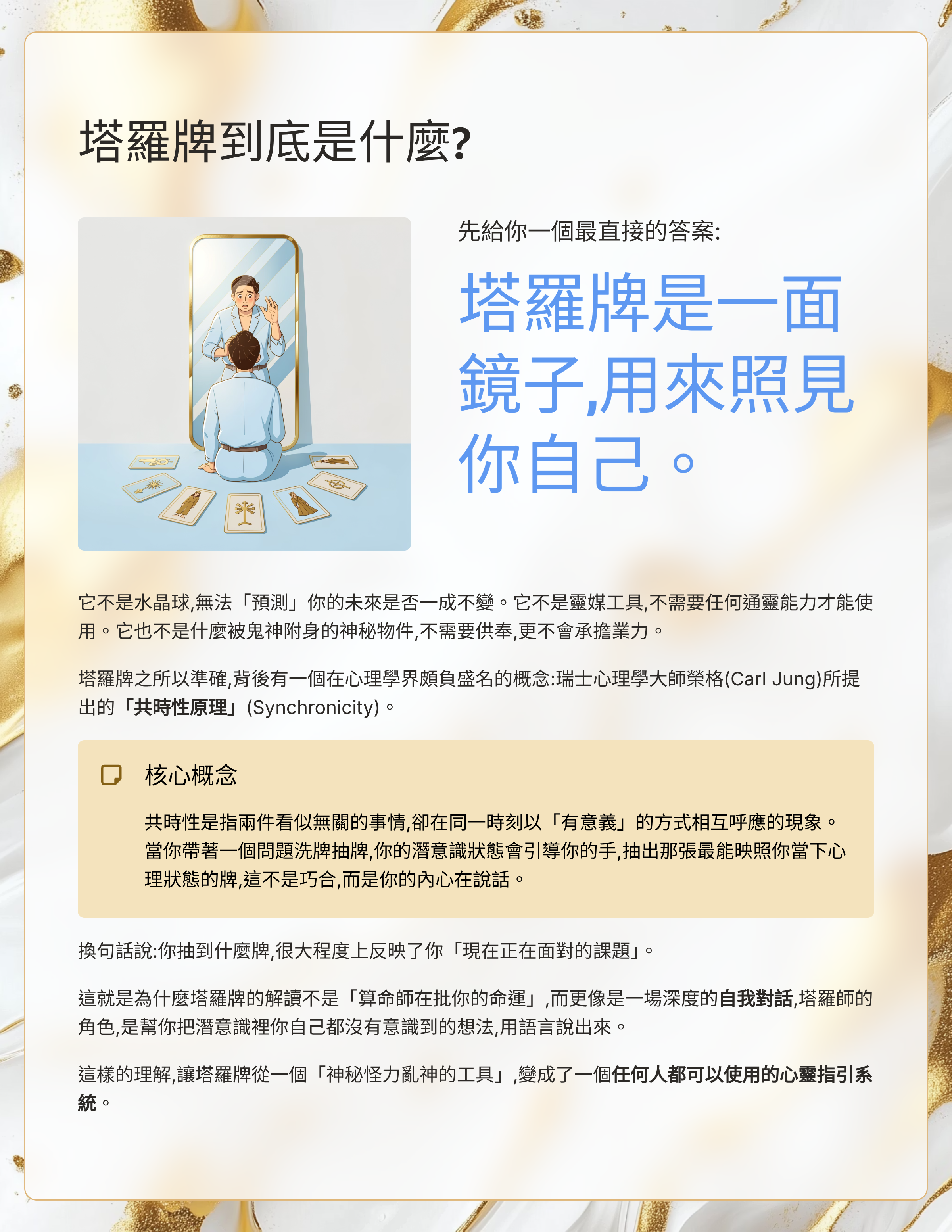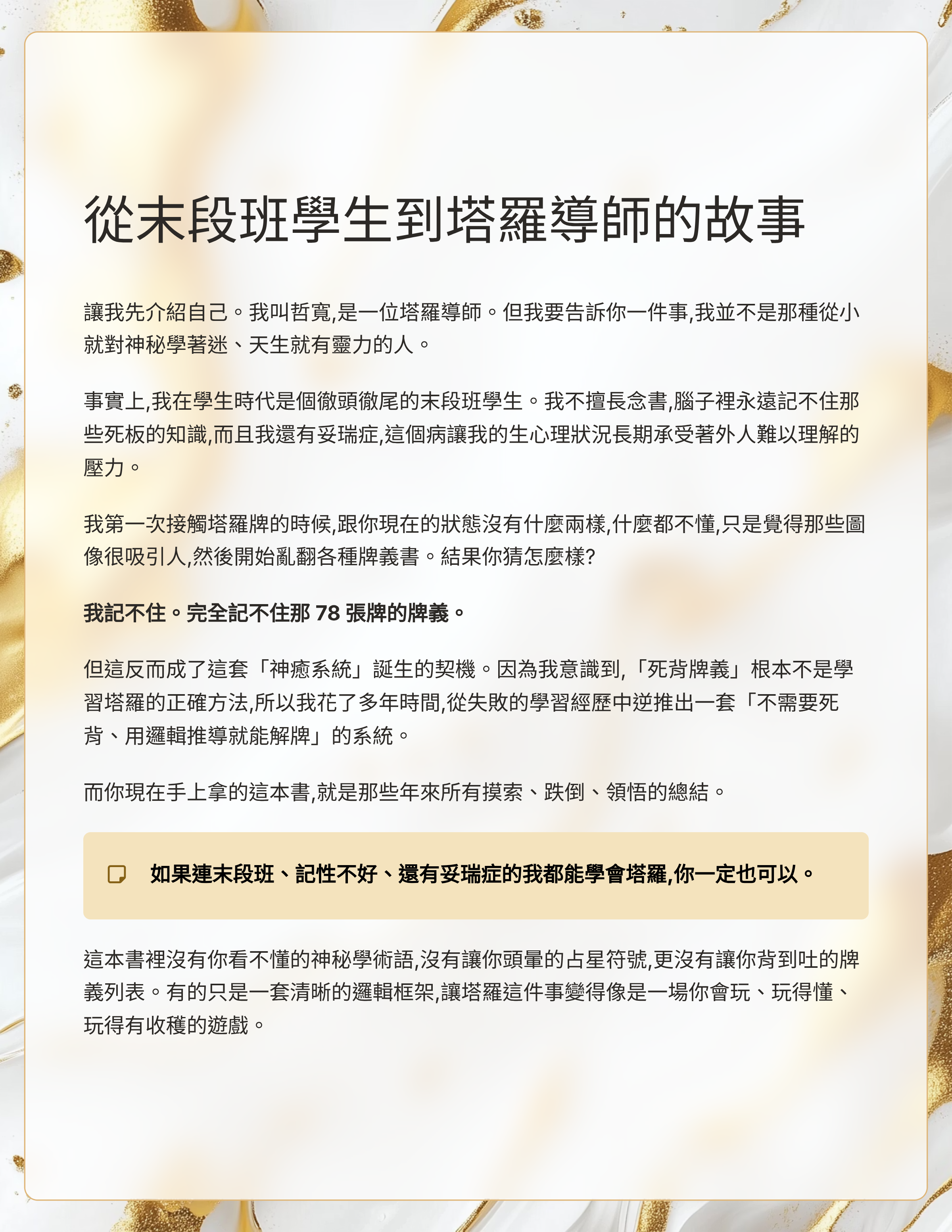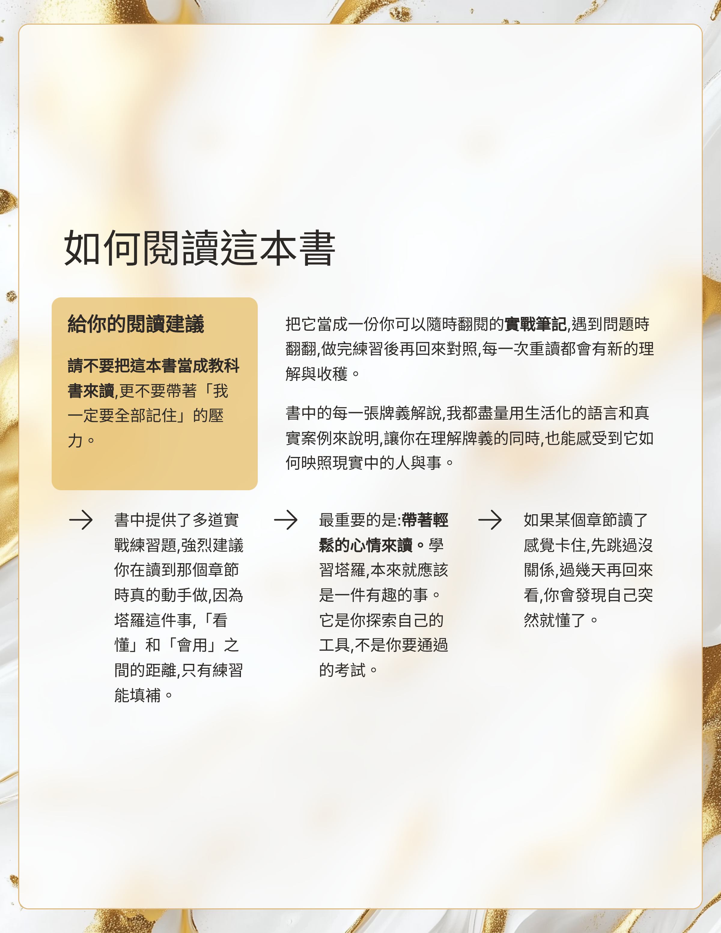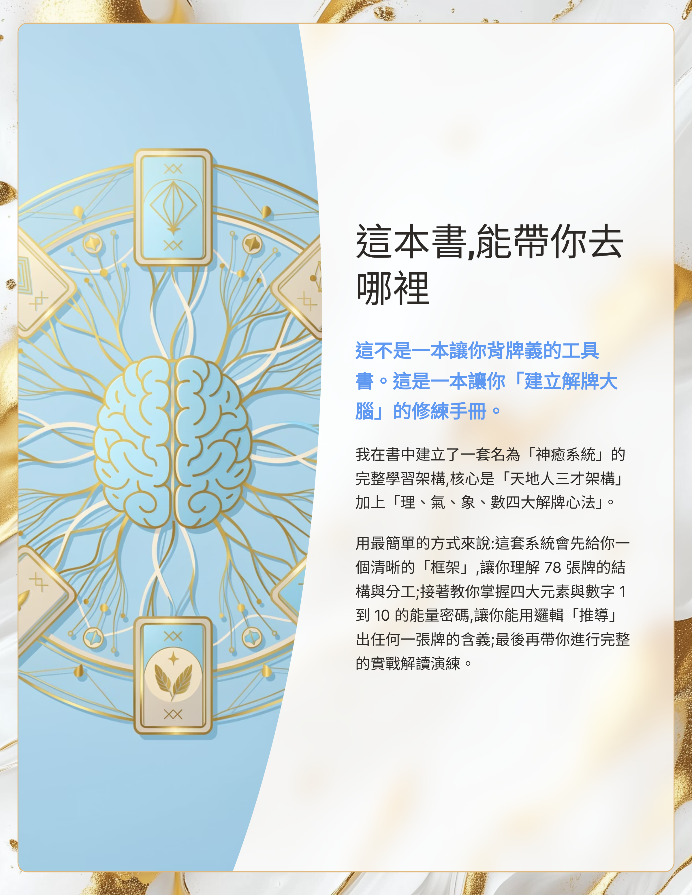 A: 可以!書中有完整的解牌公式和實戰案例,並且包含塔羅師的職業倫理章節。學完後你可以為朋友解牌,甚至發展成專業服務。