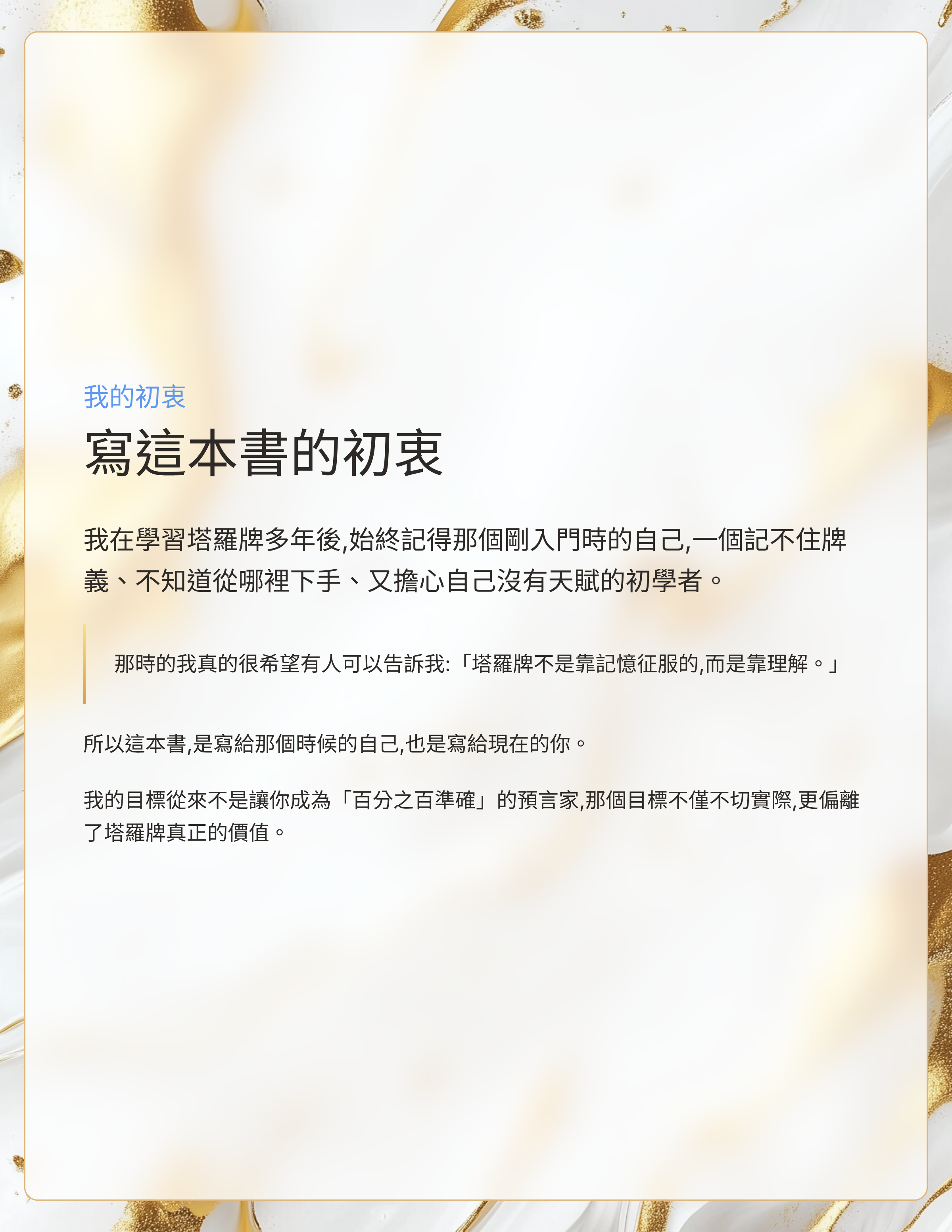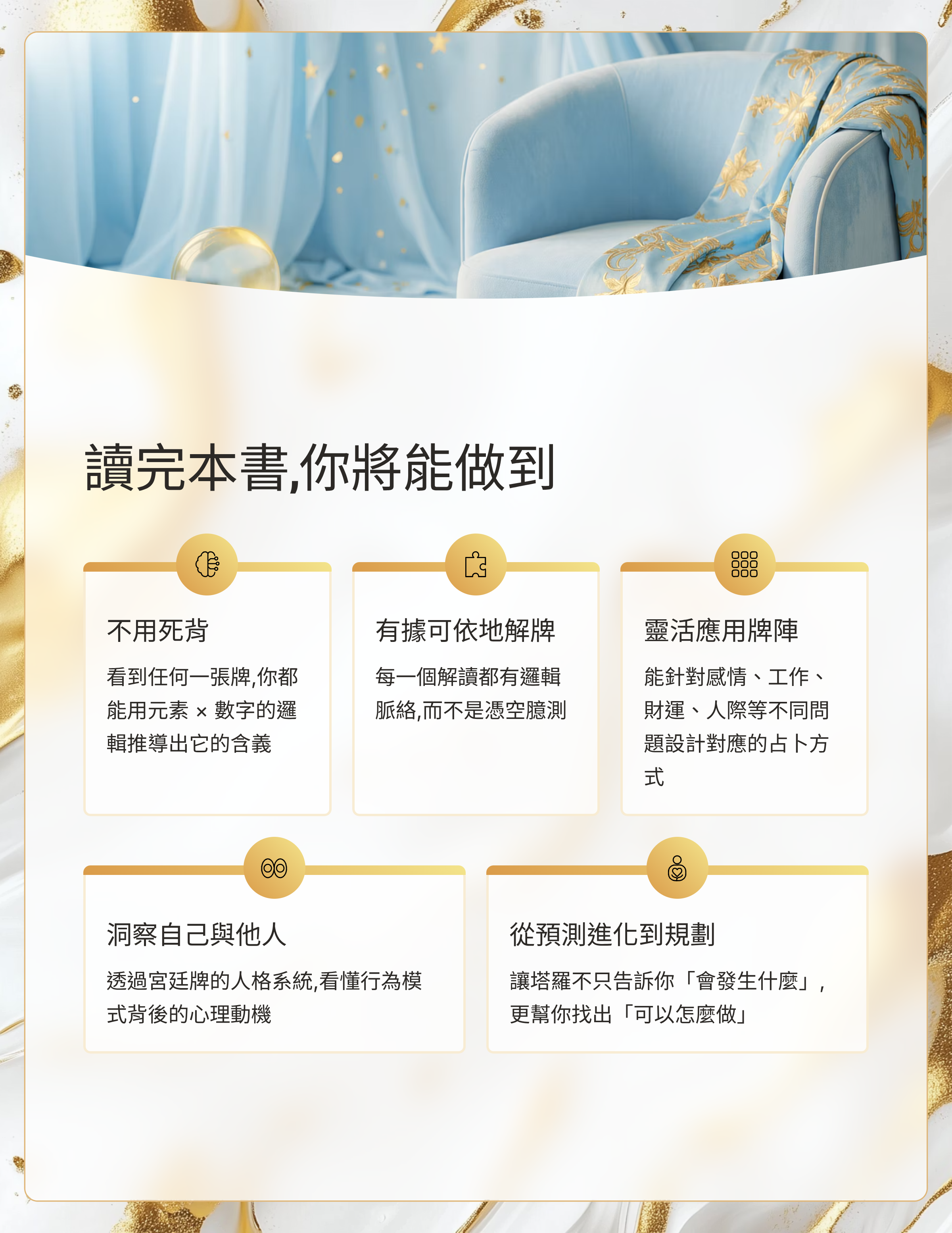 A: 最大的差異是「學習方法」。市面上的書大多要你背 78 張牌義,但這本書教你用「元素 × 數字」推導牌義,掌握系統架構後,你會發現不需要背就能解牌。